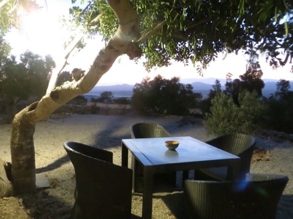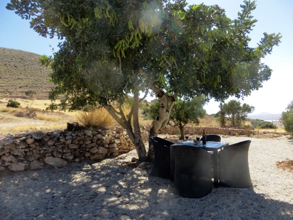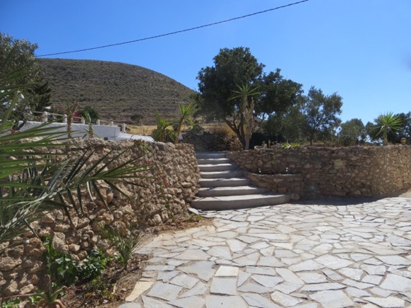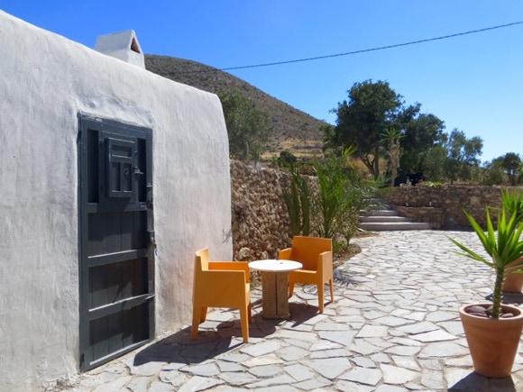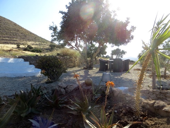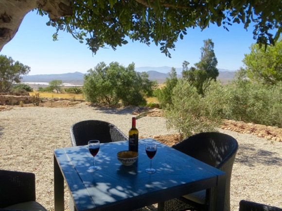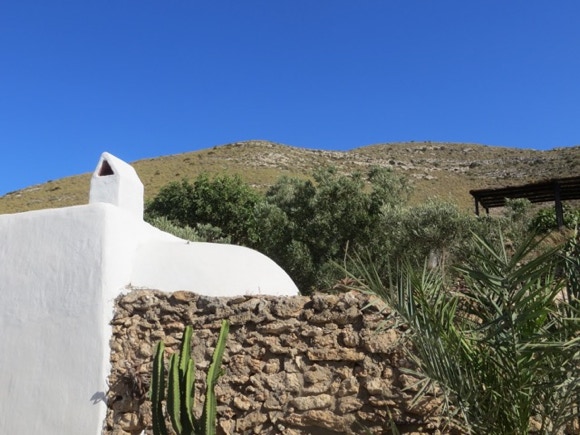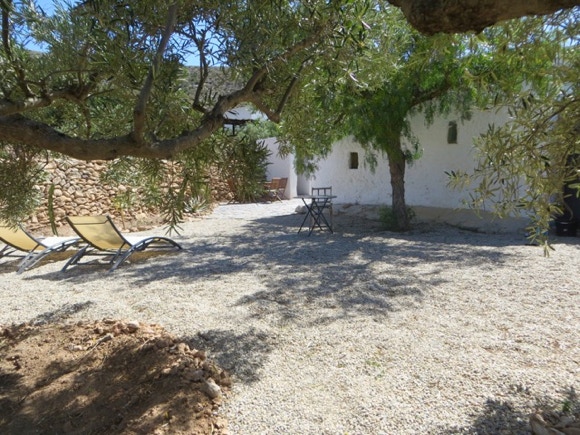 esto cortijo a la ladera del cerro blanco esta ubicada en un grande jardin en medio de bancales con olivos, en el parque natural de cabo de gata.